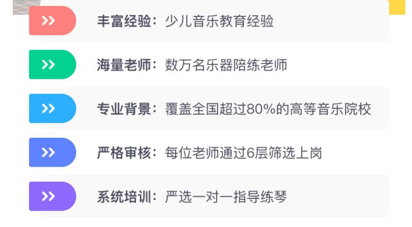 教师资源是在线音乐教育平台的发展基础和核心竞争力。许多平台标榜自己师资力量强大,教师素质高以吸引家长。VIP陪练在广告中称每位老师通过6层筛选上岗,快陪练则打出69:1的教师录用比来吸引家长。