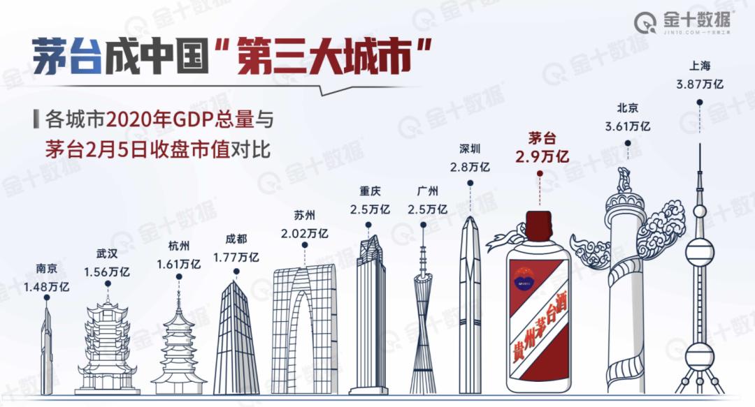 不知不觉中,茅台总市值已成为中国第三城,实现了众多城市「拳打深圳脚踹广州」的梦想,当然,这种比较只是一种调侃,并不科学。