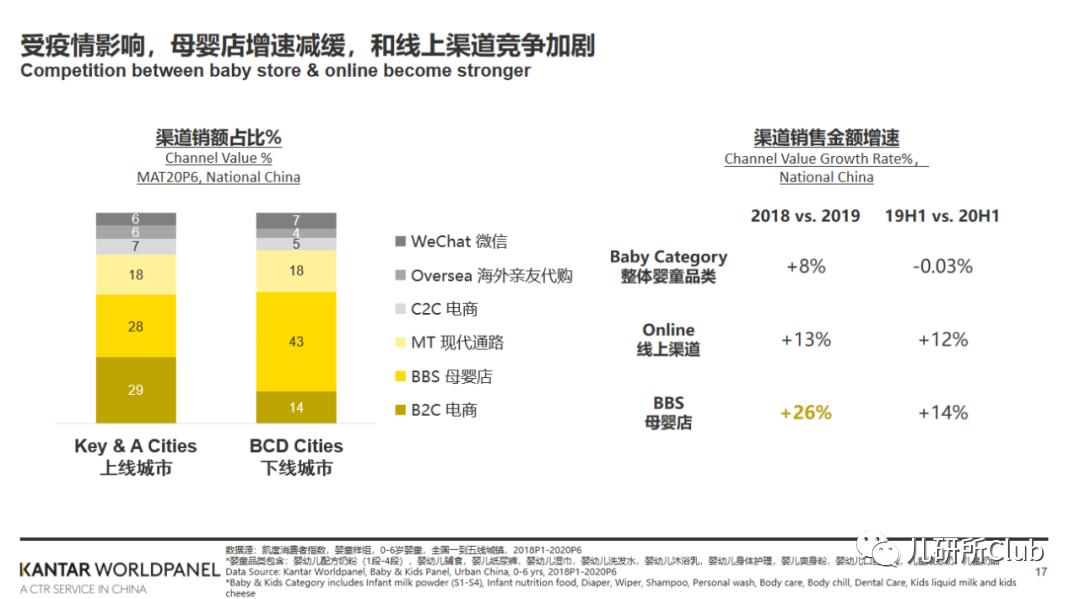 上图可以看到,上线城市的线上渠道和线下渠道占比几乎可以达到五五平分,但是下线城市的线下渠道占比远远高出线上,母婴店和MT(泛指超市、大卖场、便利店等)总共占比达到了61%。线上渠道占比虽然也在增加,但远远还没有打动绝大多数的下线城市用户。