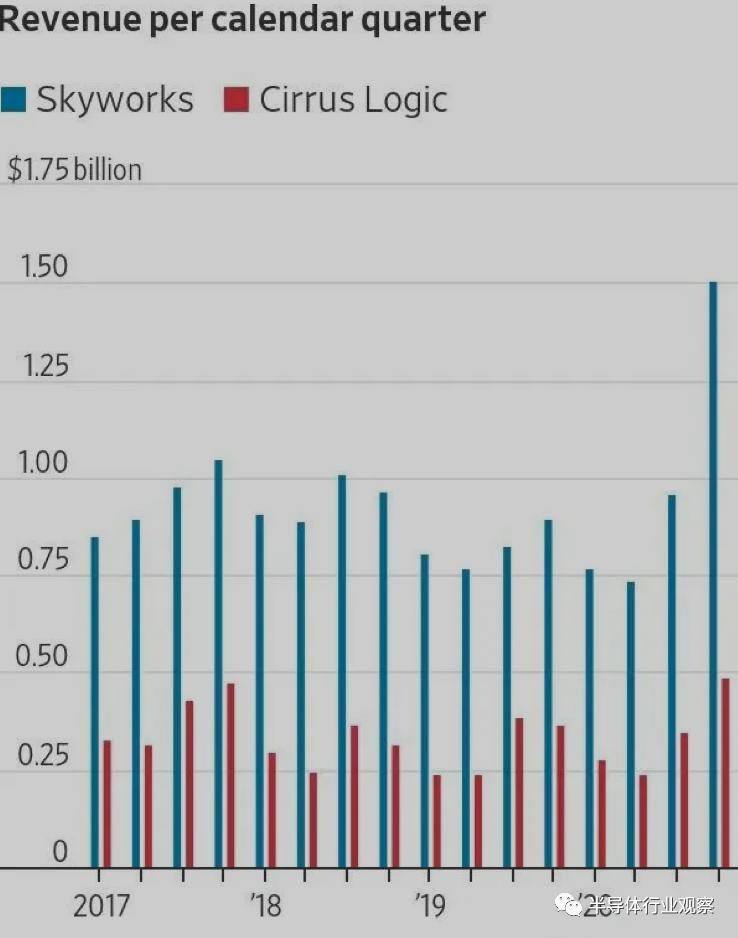 专门研究射频芯片的Skyworks上周报告称,公司四季度收入同比增长69%,至15亿美元,比华尔街的预期高42%。自该报告以来,该股已上涨了15%。Cirrus Logic公司的芯片用于音频编码。该公司周一下午报道说,其四季度收入比去年同期增长了30%,达到约4.86亿美元。