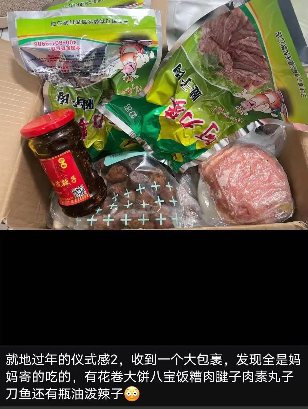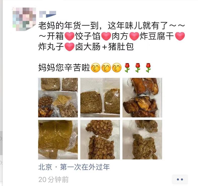 “妈妈当时听到我‘过年不回去’的消息时,我明显感觉到她的不开心。在群里回了一句‘哦’。我以为妈妈生气了,结果她连夜给我做了丸子等各种特产,准备从兰州给我寄过来。”张晨回忆道,在收到年货的那一瞬间,内心五味杂陈、非常柔软。