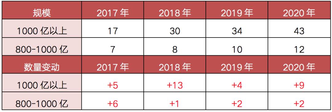 截至2020年末,全口径千亿房企数量相比去年增加9家至43家,规模为800-1000亿的房企数达到12家,800亿以上房企梯队继续扩容。
