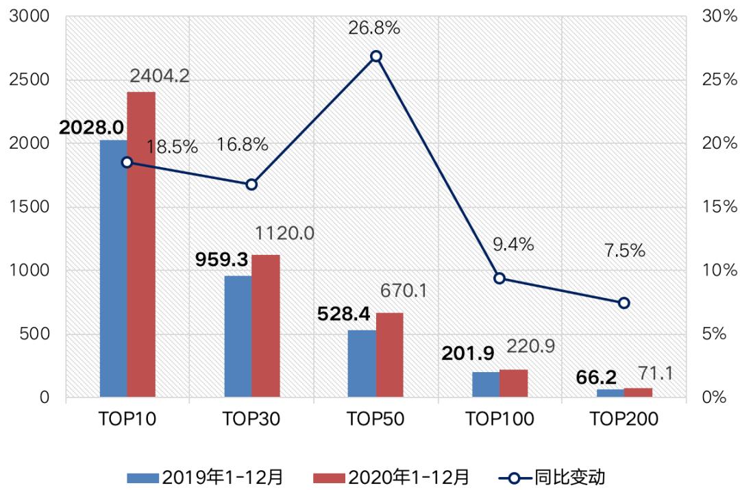 2020年,百强房企各梯队销售金额入榜门槛同比提升。其中,TOP10和TOP30房企操盘金额门槛分别提升18.5%和16.8%至2404.2亿元和1120亿元。TOP50房企竞争格局加剧,操盘金额门槛670.1亿元,同比增幅最高达26.8%。另截至12月末,TOP100房企操盘金额门槛也同比增长9.4%至220.9亿元,而TOP200房企门槛提升幅度不大。