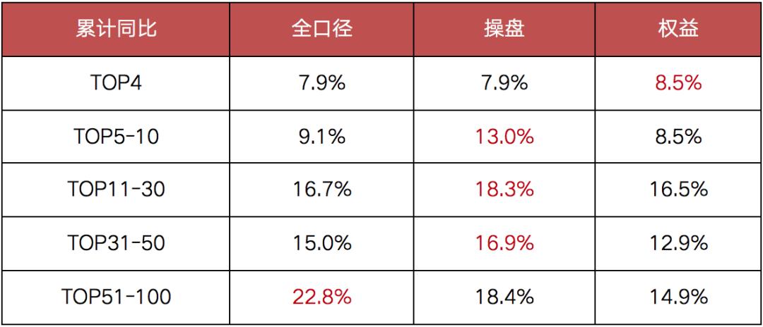 一方面,TOP50房企更注重自身规模的高质量发展,2020年TOP50各梯队的操盘业绩增速较全口径都较高。而对于TOP51-100梯队房企,业绩规模仍处于企业战略发展的重要位置。年内中小规模房企更多地通过项目合作谋求全口径业绩的增长空间,全口径业绩增速达22.8%,显著高于操盘和权益口径。