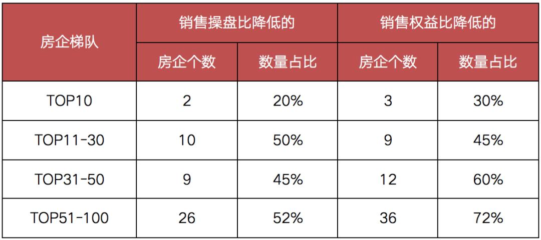 另一方面,当前市场背景下,随着更多的中小规模企业通过合作开发提升全口径业绩规模,其整体的项目操盘和权益比例也相应降低。2020年在TOP51-100梯队房企中,销售操盘比、销售权益比降低的房企个数为26家和36家,占比分别达到52%和72%且高于其他梯队房企。