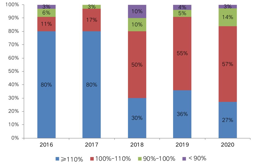 从2020年房企的目标完成情况来看,绝大部分在年内设定了业绩目标的规模房企,均完成了年度业绩目标。其中,自二季度以来,有部分规模房企积极抓住销售窗口期、加速去化,在11月就提前完成全年目标。