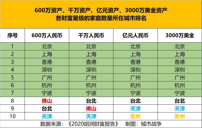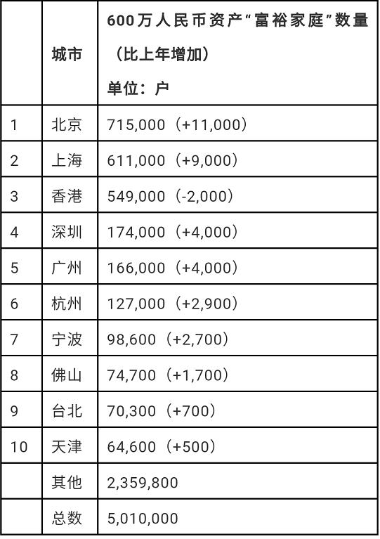 千万资产富裕家庭户数,从高到低,仍然是北京、上海、香港、深圳、广州、杭州。