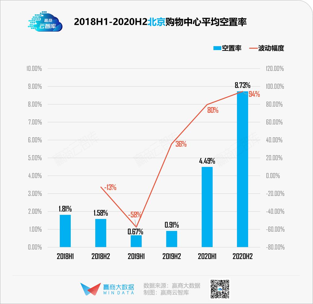 疫情反复对北京零售市场的打击,在2020年下半年得以凸显。此期间,北京购物中心平均空置率环比上涨94%,达到8.73%,是去年同期的近8.6倍。