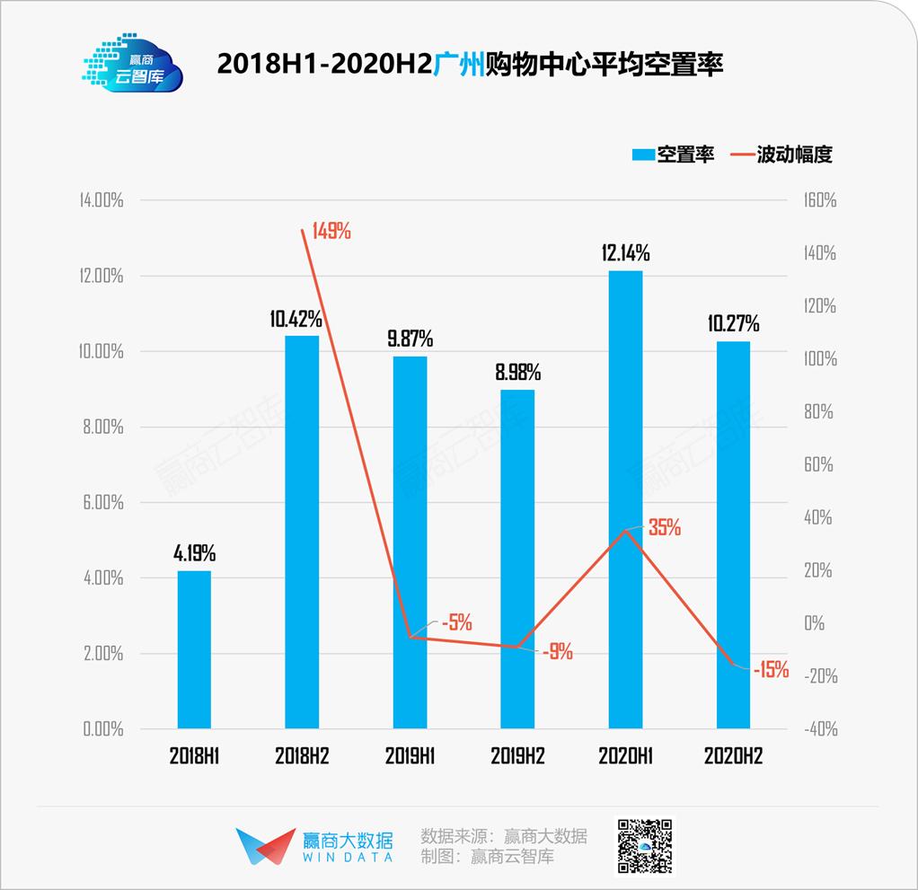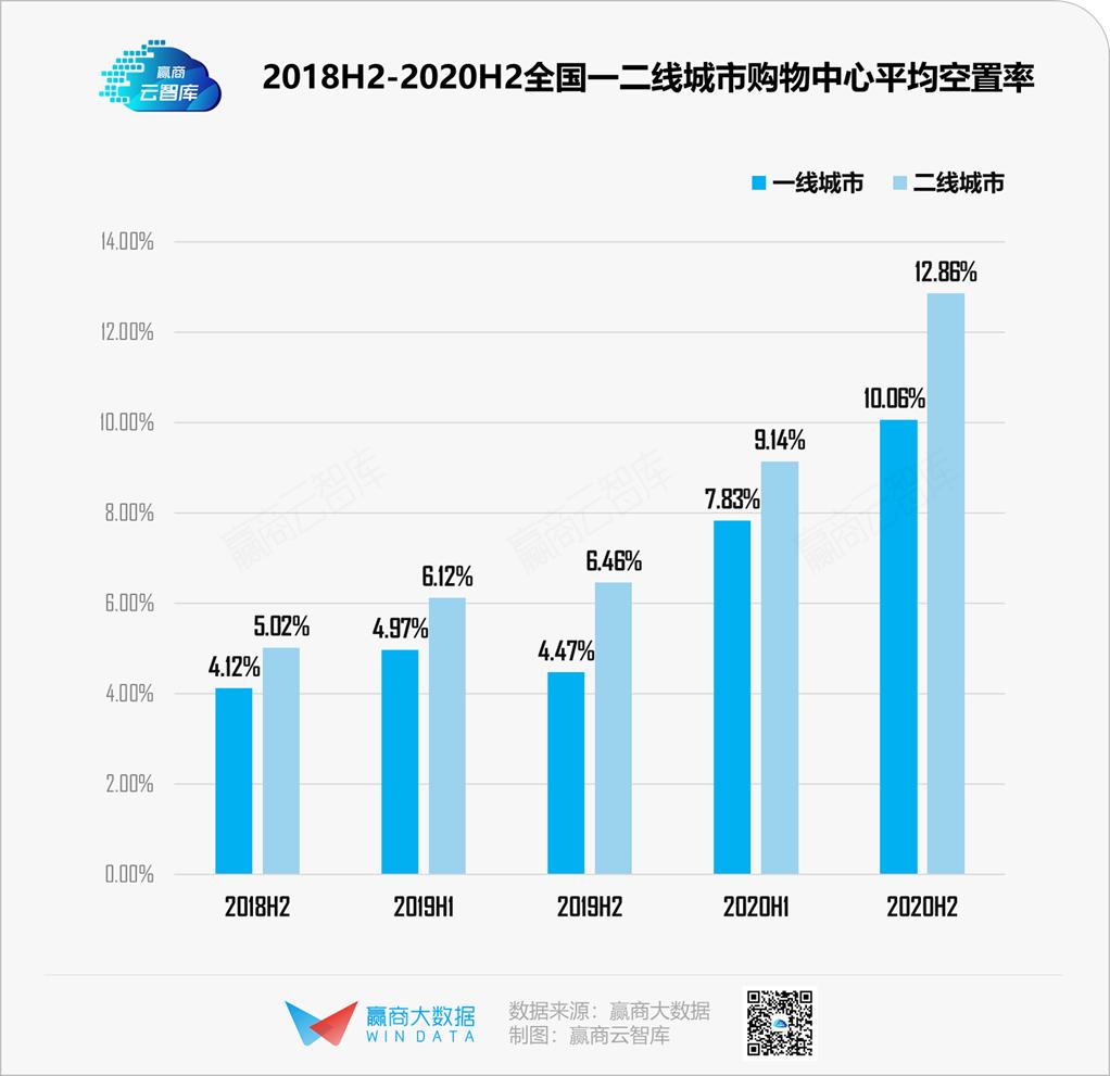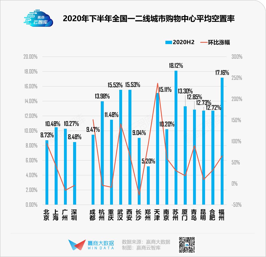据赢商大数据监测,2020年下半年全国19个一二线城市近千家已开业购物中心调整频率加快,整体出租低迷,平均空置率环比涨幅近32.5%至11.77%。