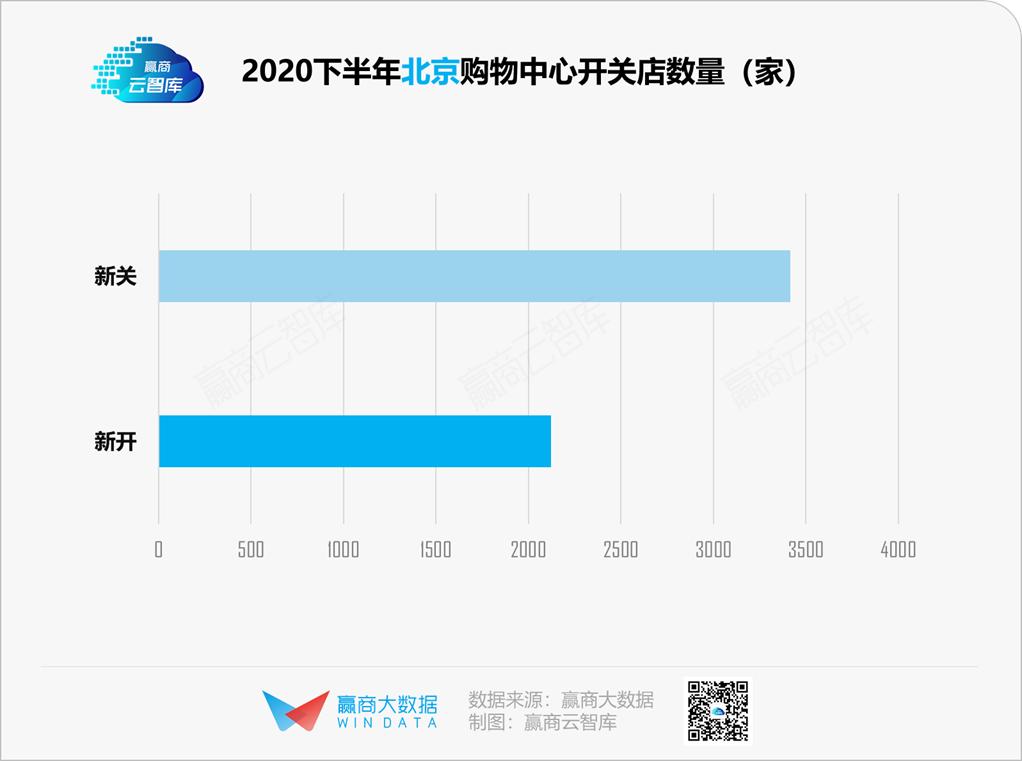从需求端看,据赢商大数据监测,2020年下半年北京购物中心(商业面积≧5万㎡)开关店数量为5537家,其中新关门店3415家,远超新开门店数(2122家),开关店之差为一线城市之首。