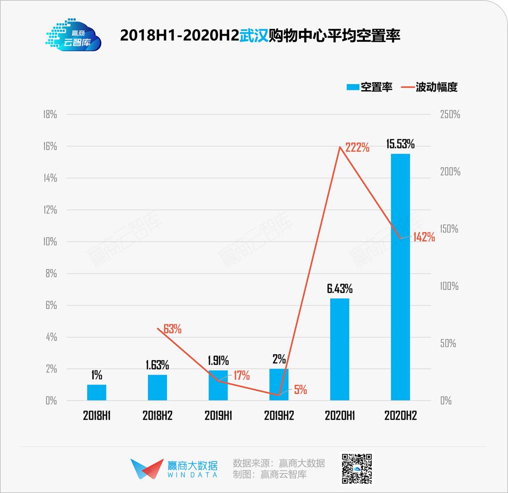 2020年下半年,武汉市购物中心平均空置率环比上涨142%,达到15.53%,是去年同期的近8倍。其中,市级商圈购物中心平均空置率为15.97%,区级商圈购物中心平均空置率为14.33%。
