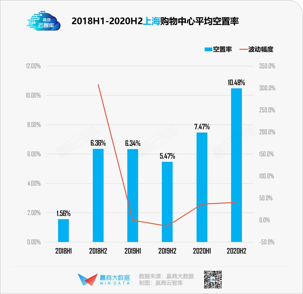 2020下半年,上海购物中心平均空置率环比上涨40.3%,达到10.48%,创下近三年新高。其中,市级商圈购物中心平均空置率为11.20%,区域商圈购物中心空置率为10.20%。