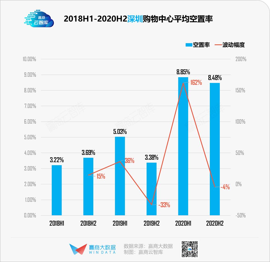 2020年下半年,深圳市购物中心平均空置率为8.48%,环比下降4%。
