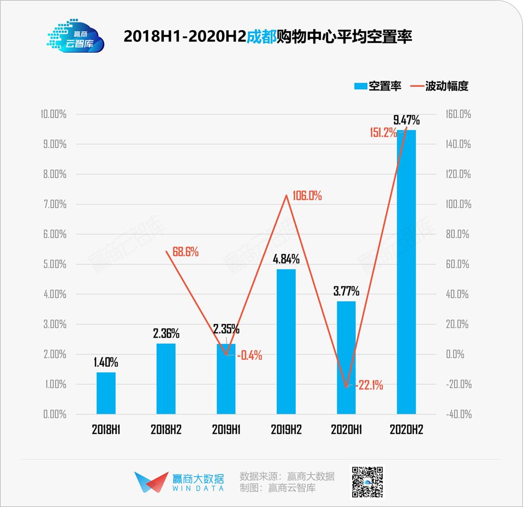 2020年下半年,成都购物中心平均空置率环比上涨151.2%至9.47%。