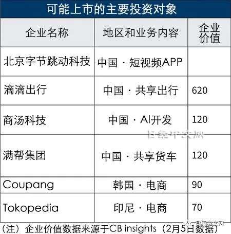 今后的“预期IPO名单”也包括很多中国企业。不仅有被视为基金最大投资对象的滴滴出行,北京字节跳动科技等中国独角兽企业似乎目前正在准备上市。