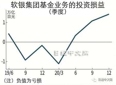 背后是基金业务的损益改善。2020年4~12月的基金业务投资损益为盈利2.7287万亿日元(上年同期亏损7290亿日元),复苏势头明显。因新冠疫情,2020年1~3月一度出现了超过1万亿日元的亏损。优先出售资产,暂时停止了新增投资,后来随着全球股市的快速反弹,投资对象企业的估值上升,推高了基金的账面收益。