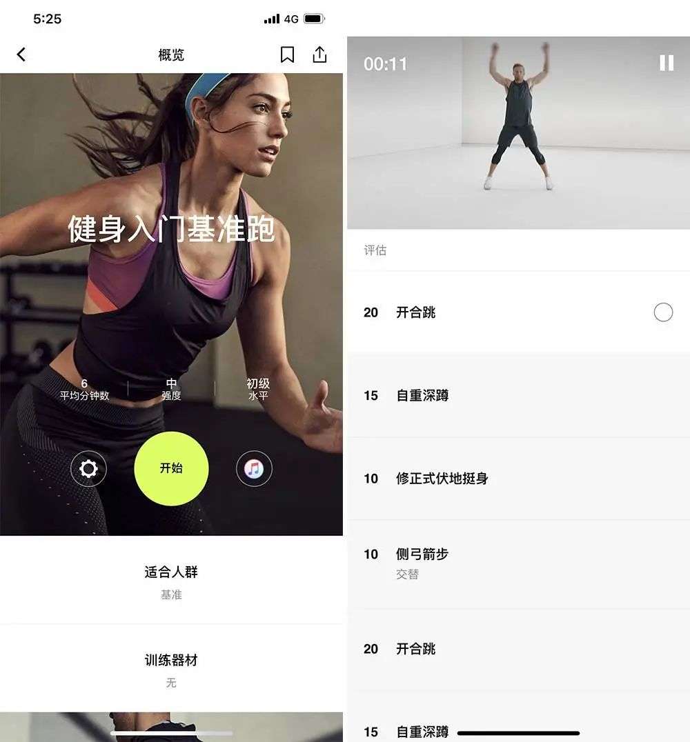 在健身界面,app 的上部会显示标准的健身动作,而你则要模仿教练完成对应的动作。《Nike Training Club》可以与 Apple Music 进行联动,让你在运动时,听到自己 Apple Music 里的歌单。