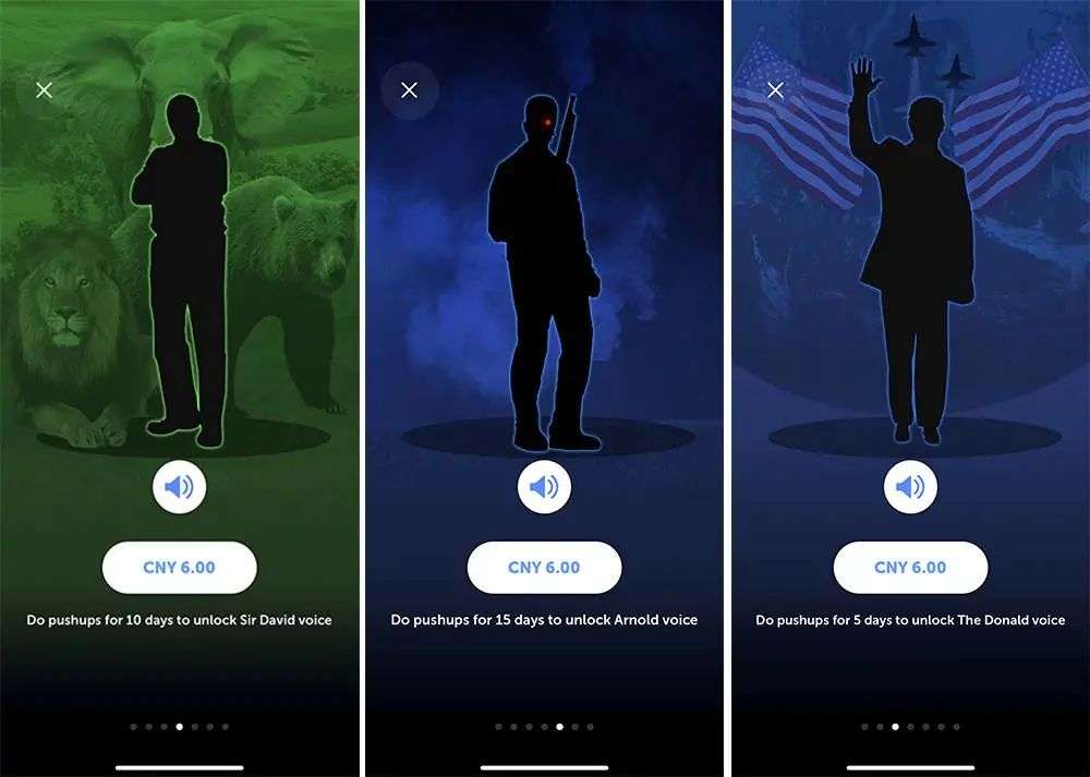 相比只为你鼓励的健身 app,《22 天 22 次俯卧撑挑战》最有特点的就是各具特色的教练语音了。虽然一些话语有些刺耳,但的确可以很好的激励我们坚持运动。app 免费提供了男声和女声,如果你愿意付费的话,还可以购买 BBC 主持人 Sir David、终结者主演施瓦辛格等角色的声音,甚至……还有那个男人。