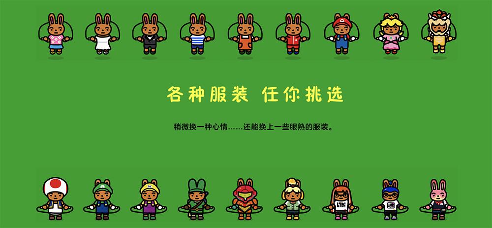 按下 Joy-Con 的左右(Y、A)键,就可以让小兔子更换服装,你喜欢马力欧还是林克?作为 Switch 玩家,相信你一定能在《跳绳挑战》中找到喜欢的外观。