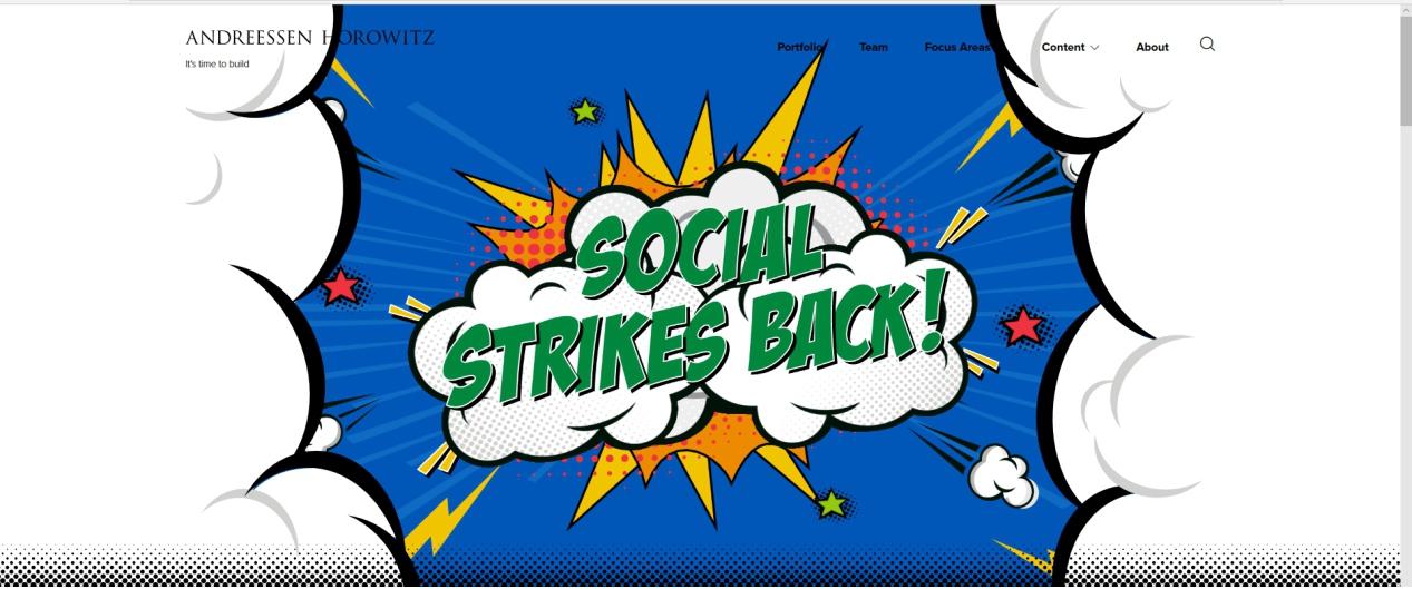 作为A16z最新提拔的合伙人,Sriram主要负责的版块正是社交。他是请到多位大佬的栏目 “Good Time”的主持人。在多家社交媒体巨头工作过的他,此刻也充满了斗志。近期的A16z野心勃勃的在官网打出了:“社交回来了!”的口号,并发长文称能利用群众碎片化时间、感官上更亲密、让用户感觉更放松、领域内竞争对手更少的音频社交软件将是大势所趋,拥有着未来将与视频社交软件比肩竞争的巨大潜力。