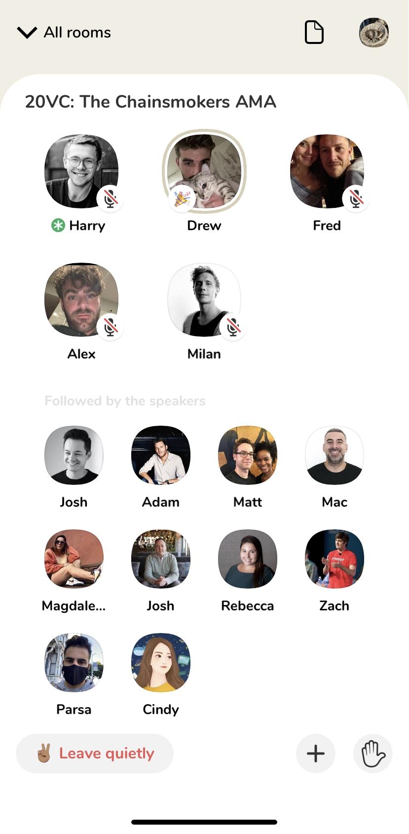 点进房间之后就可以旁听主持人们的讨论了,在这个界面你可以看到是谁在说话,也能看到主讲人关注的用户(这个功能可以让圈子同质扩张,你关注的人感兴趣的更大概率你也感兴趣,但隐私不保)。如果你想讲话,可以举手示意主持人,在得到允许之后发言。不想听了也可以默默退出。