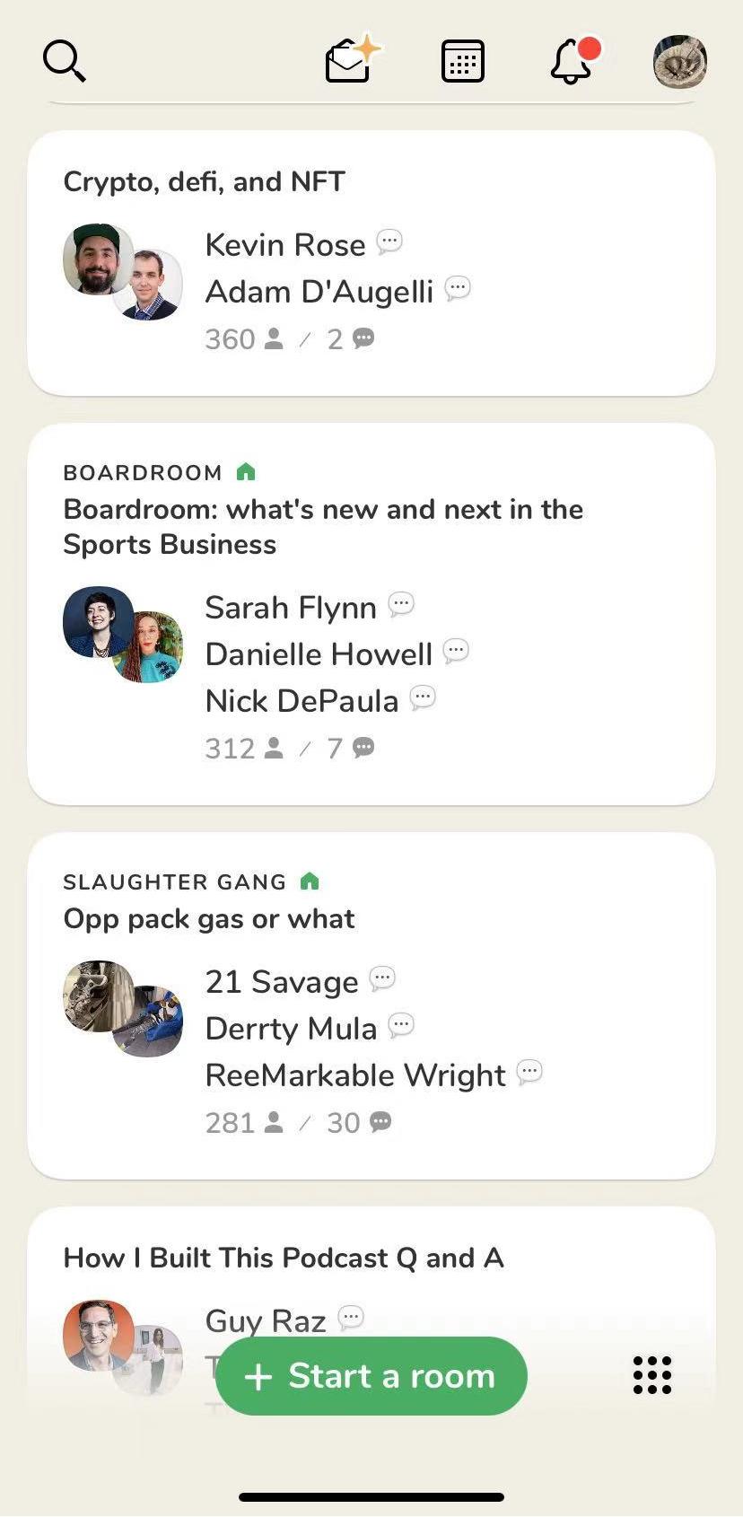 (Clubhouse推荐页面的截图,正在进行的有讨论加密货币的,也有讨论体育经济的,还有美国知名说唱歌手开设的房间)