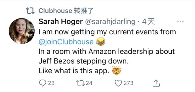 难怪有外国人在Twitter上惊叹道:“我现在都用Clubhouse得到我的消息,现在我和亚马逊的高管在一个房间里,听他们讲贝索斯离职的事情。这个app也太神奇了吧!”