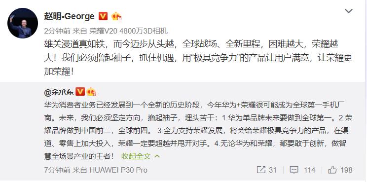 2019年4月2日,华为消费者事业部CEO余承东在微博立下了“全新历史阶段”下的新目标:华为单品牌全球第一,荣耀全球第四中国第二。