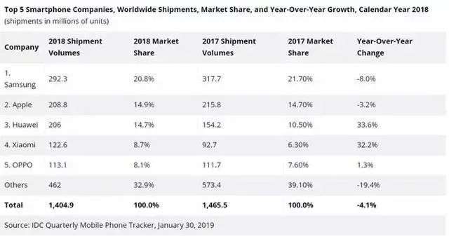 自2016年起,华为、OPPO、小米、vivo持续站稳全球前六,即便在全球、中国市场双降的2018年,这四大国产手机品牌依旧保持全球出货量增加,成为逆势增长的独特风景。