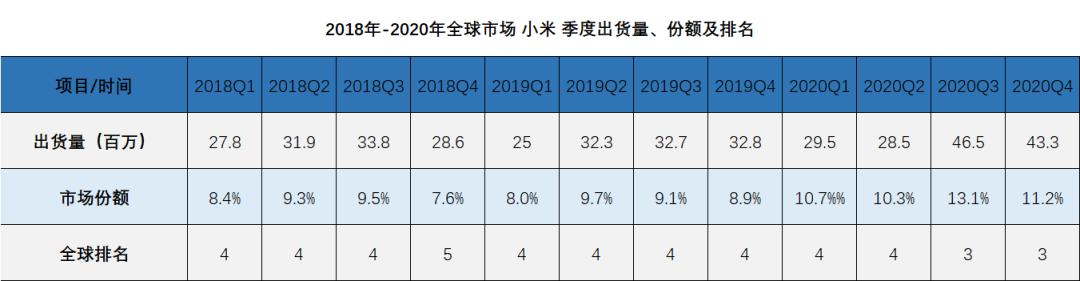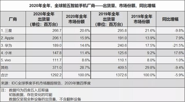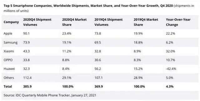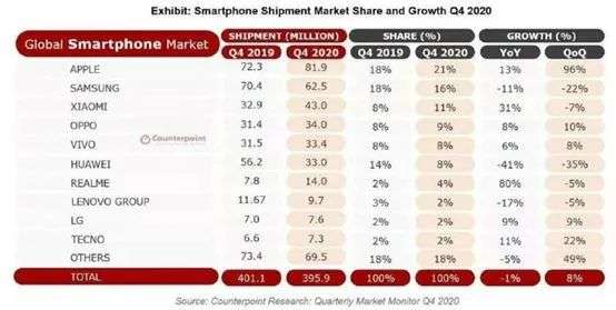以2020年Q4数据对比2019年Q4来看,全球前十名的手机厂商排名及份额并无明显改变: