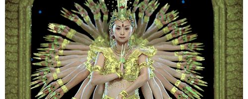 共21位平均年龄17岁的聋哑人,最小的只有13岁,以知名残疾人舞蹈演员邰丽华为首,立于莲花台上,创造出千手观音的形象。从千手显现,魔幻变手,再到分队上演“三头六臂献慈爱”,五彩夺目的灯光中,菩萨面目和善,嘴角露出微笑,向世人传递良善。
