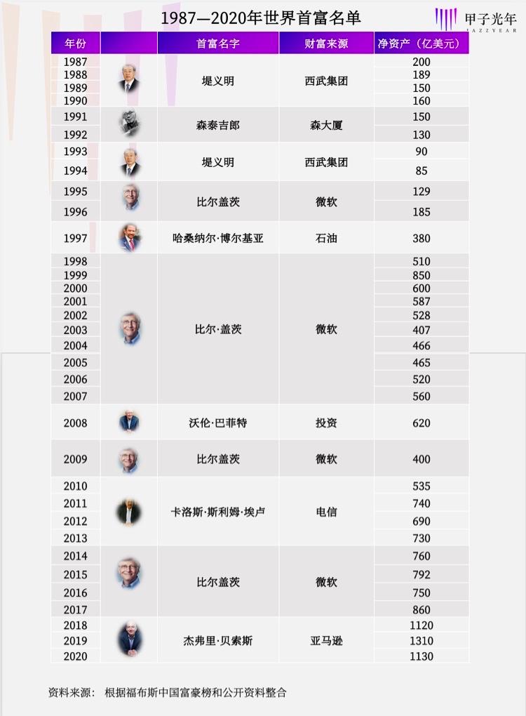 「甲子光年」整理了福布斯全球富豪榜有史以来的首富名单 (1987-2020) ,如下图所示: