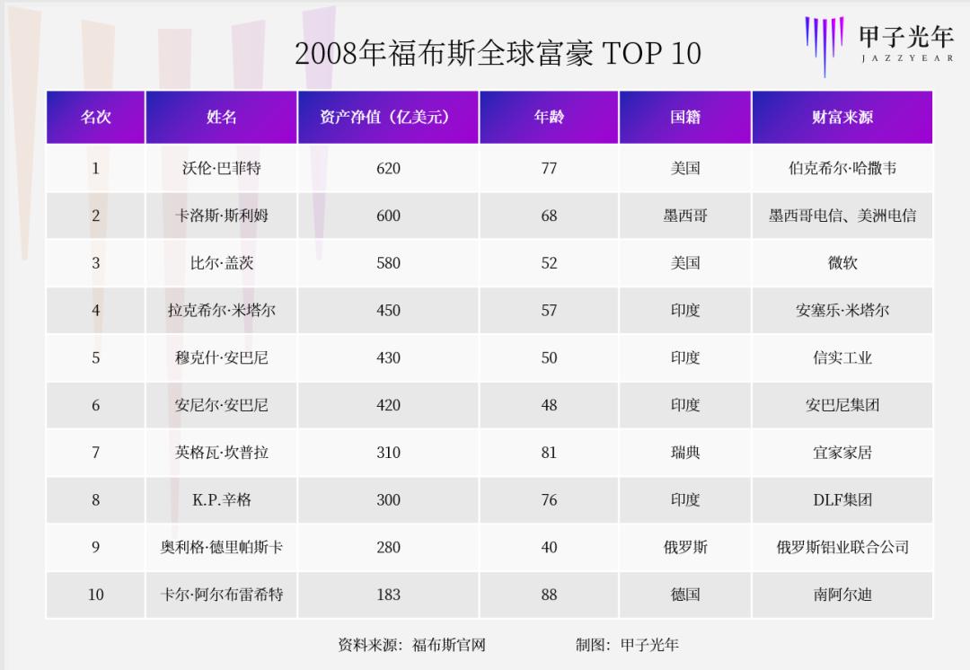 从2008年的世界年度首富TOP10榜单上不难看到,发展中国家与发达国家平分秋色,榜单上不再是美国“只手遮天”,而是呈现出多元化的走向——印度4位富豪,俄罗斯、墨西哥、瑞典、和德国各有1位代表。