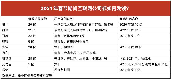 自此之后,为争夺春晚红包的合作机会,互联网公司都愿意广撒钱。过去五年间,依次与春晚红包合作的分别有:支付宝、淘宝、百度、快手。它们通过发红包互动方式增加用户规模,比如2019年百度日活从1.6亿冲上3亿、2020年快手完成了DAU到3亿的KPI。这个期间,不仅合作的主APP收益,它还携带“全家桶”的业务集中在此聚光灯下:要拿更多红包,先下载我其他的APP。