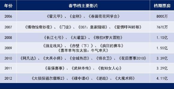 从2006年至2012年春节期间的电影票房来看,2010年《阿凡达》使春节期间的票房翻了一番,2012年在两部好莱坞大片加持下,达到了4.11亿票房,比2011年增长了24.9%。从此,人们将目光聚焦在七天春节档,而不再是跨度较长的贺岁档。