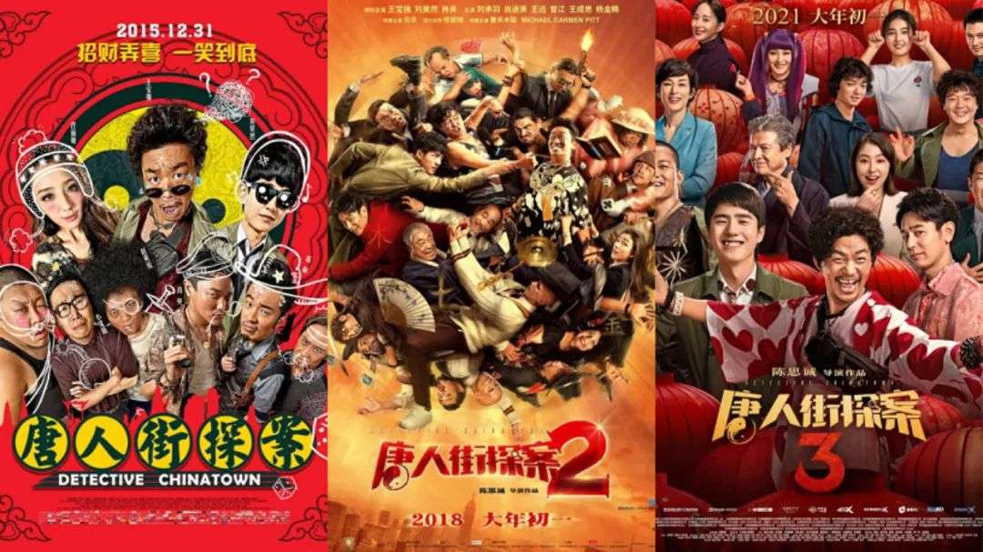 “唐探”系列的第一个特征——喜剧。单一类型的推理电影在国内受众较为有限,相较之下,喜剧片老少皆宜,但单纯的喜剧片也存在市场局限、天花板较低的问题。因此,2015年《唐人街探案》一出现,“推理+喜剧”的新奇模式很快将其推为当年的影院黑马。
