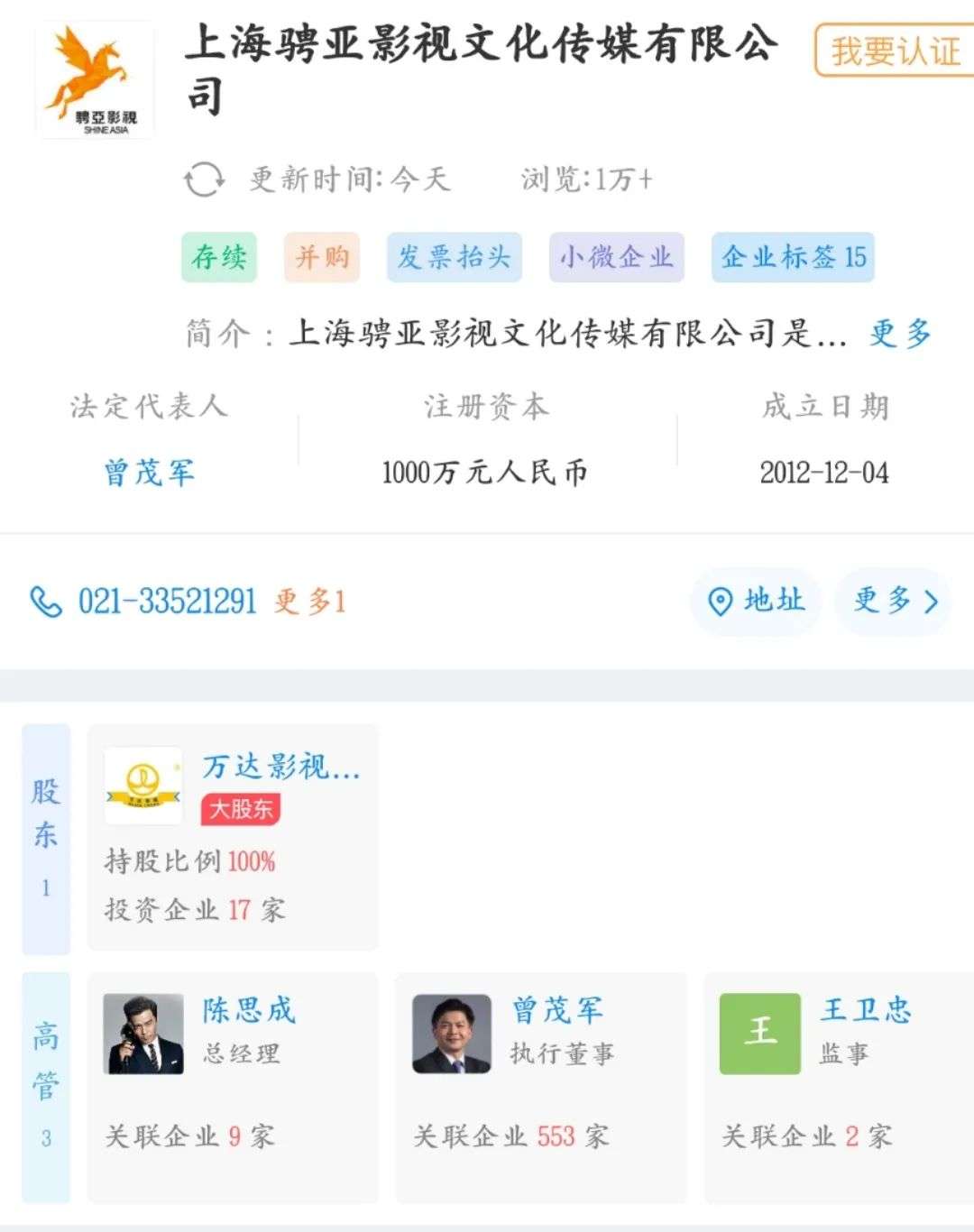 当年,万达影视的持股比例为60%,陈思诚本人持有30%的股份,而企查查显示,如今上海骋亚影视文化传媒已由万达影视100%持股。