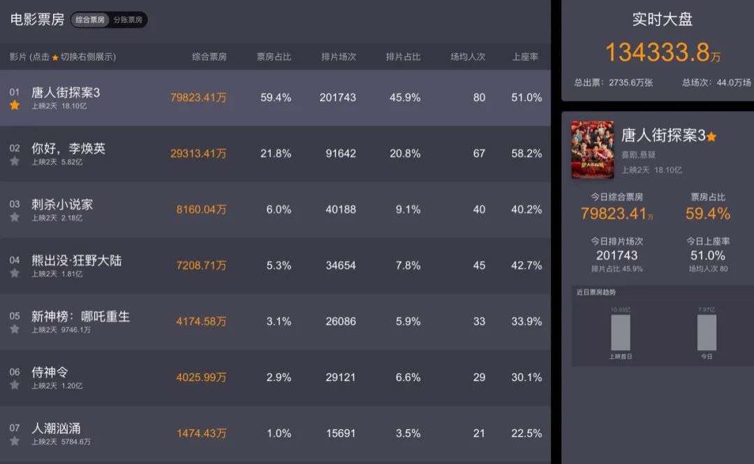 猫眼专业版显示,截止2月13日,《唐人街探案3》综合票房占比近六成,排片占比约46%,远超同期上映的其它几部影片《刺杀小说家》《熊出没·狂野大陆》《新神榜·哪吒重生》《侍神令》《人潮汹涌》。