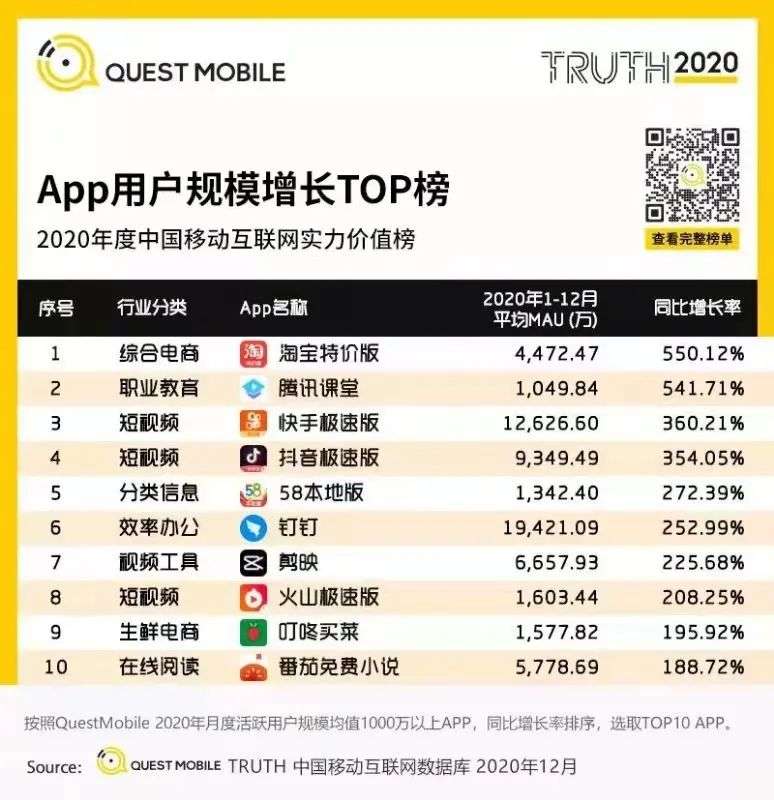 自从去年3月26日正式上线以来,淘宝特价版的用户数据便一路飙升。根据阿里最新财报显示,淘宝特价版月活目前已经破亿,稳坐下沉市场前三。QuestMobile 1月26日的报告也指出,淘宝特价版以550%的同比增长成为年度用户规模增速最快的手机应用。