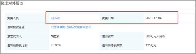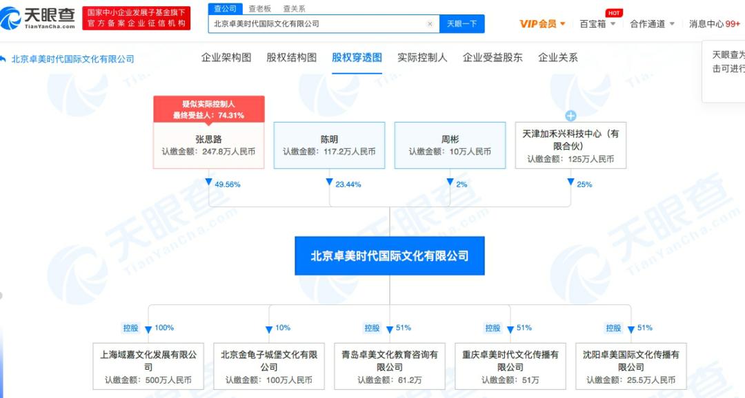 从天眼查了解到,北京卓美时代国际文化有限公司为重庆卓美时代文化传播有限公司最大股东,占51%的股份,认缴出资51万人民币,认缴出资日期为2026年12月31日。除重庆之外,北京卓美时代国际文化有限公司还在青岛卓美占了51%的股份,在沈阳卓美时代文化传播有限公司占了51%的股份。据当时天眼查信息显示,著名导演冯小刚在北京卓美时代国际文化有限公司仅持股25%,然而在2020年12月4日,一则有关冯小刚退股的消息被公示,公示显示由冯小刚参股25%的某公司发生股东结构变动,冯小刚撤资。