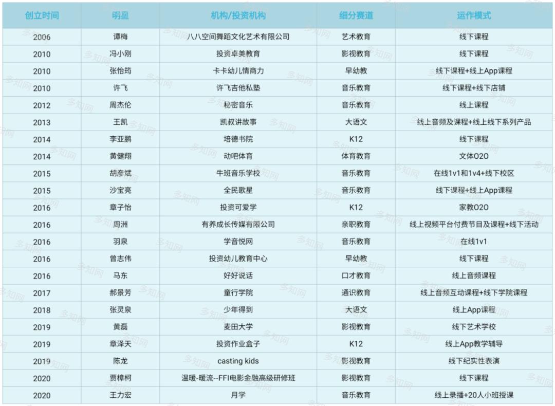 第一是自身的行业经历已经有了一定量的积累,转型行业相关教育。一方面是为行业培养人才,另一方面长期在行业中,对行业的痛点等问题掌握比较到位。另外,自身专业特长和界内积累的资源已经达到一定的程度。如上文提到的马东、贾樟柯、冯小刚、黄健翔,还有多知网此前报道过创立“牛班”的胡彦斌、投资“学音悦”的羽泉。这类明星或是自己开办学校,或投资参股培训机构。这样也便于将自己拥有的行业内资源直接输送到项目中。