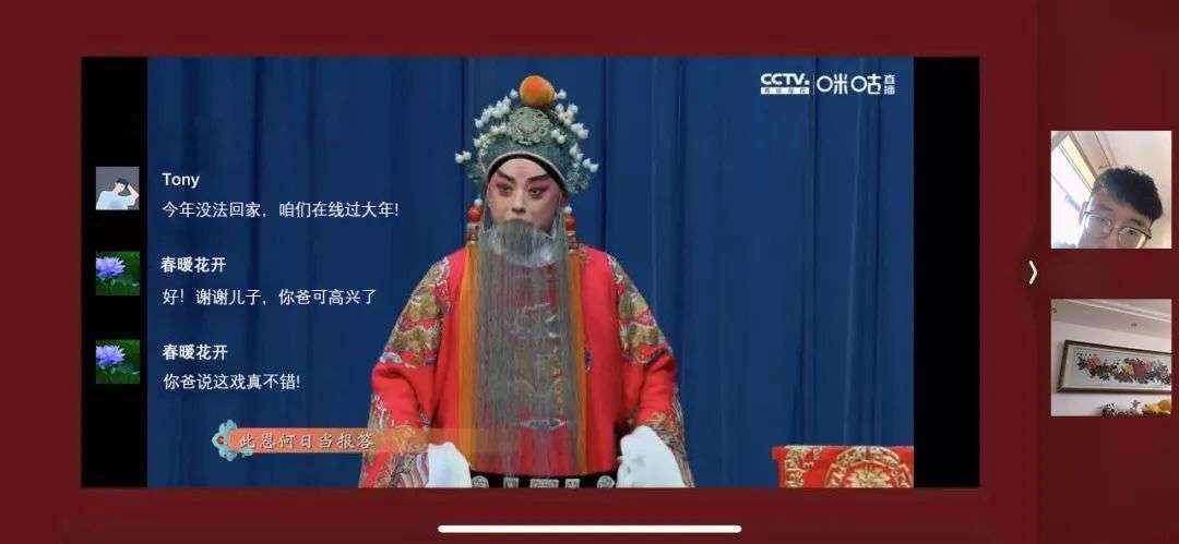 想起父亲的爱好,大年初一晚上,松柏购买了一张京剧云大戏《龙凤呈祥》的电子票,邀请全家来到“云包厢”里,一起看了一场《龙凤呈祥》,边看边聊,很是开心。