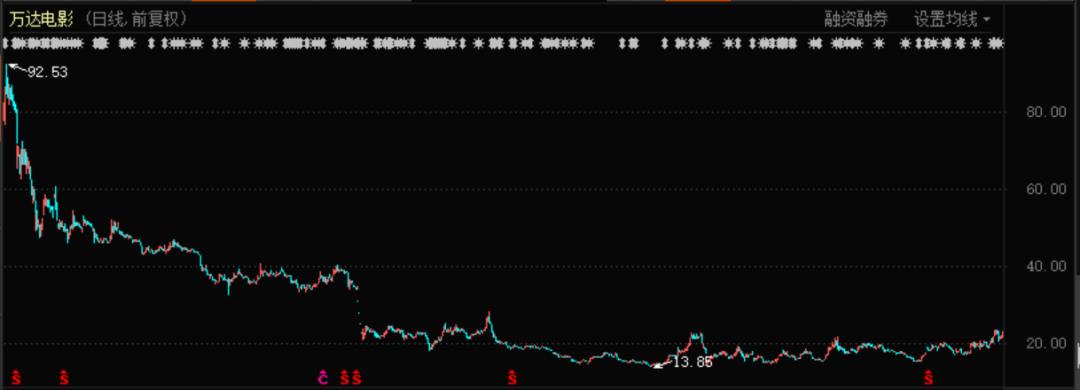 头部企业万达电影(SZ:002739)自2015年12月21日创出92.53元股价、市值2000多亿元的天价后,就开始了连续不断的下跌,最大跌幅超过了80%;
