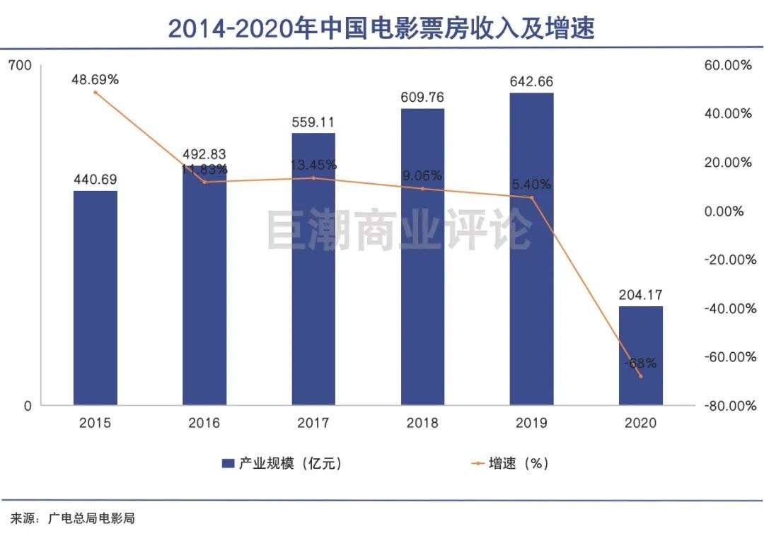 通过这些数据可以看到,2015-2020年之间,全国票房总收入虽然在不断增长,但同比增速放缓明显。与此同时,在行业扩张、资本介入的状态下,院线数量却出现了迅猛增长。