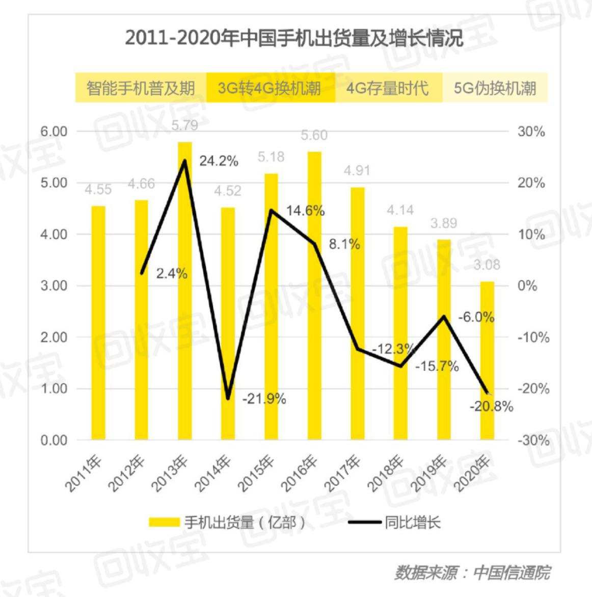 根据中国信通院数据,2020年中国手机市场出货量仅有3.08亿台,20.8%的下滑速度达到了近十年的第二名,仅次于2014年的21.9%。但问题在于,2014年中国手机市场出货总量为4.52亿部,与今天的存量市场竞争大相径庭。