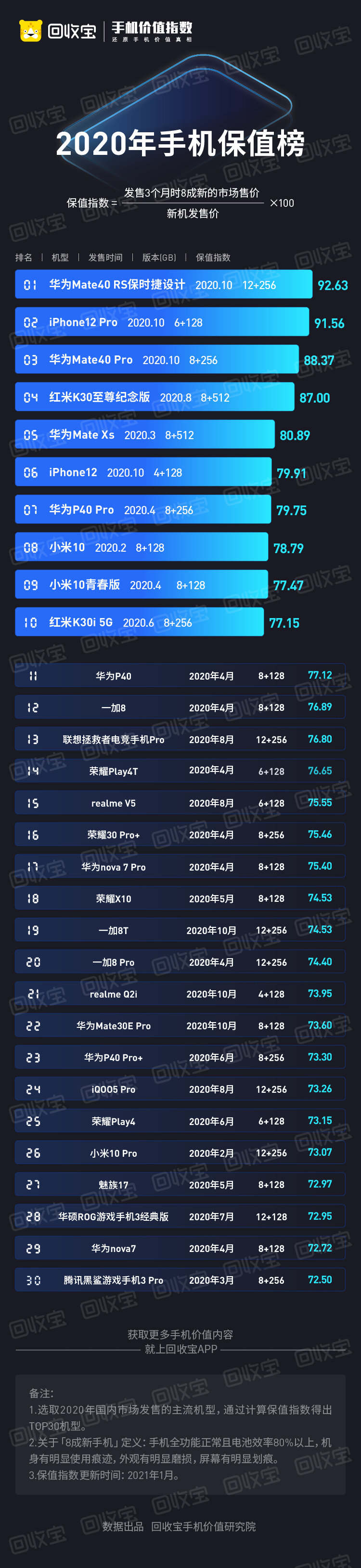回收宝2020年机型保值榜根据保值指数排列,得出了10款最保值的2020年新上市手机,依次是:HUAWEI Mate 40 RS保时捷设计、iPhone 12 Pro、HUAWEI Mate 40 Pro、Redmi K30至尊纪念版、HUAWEI Mate Xs、iPhone 12、HUAWEI P40 Pro、小米10、小米10青春版、Redmi K30i 5G。