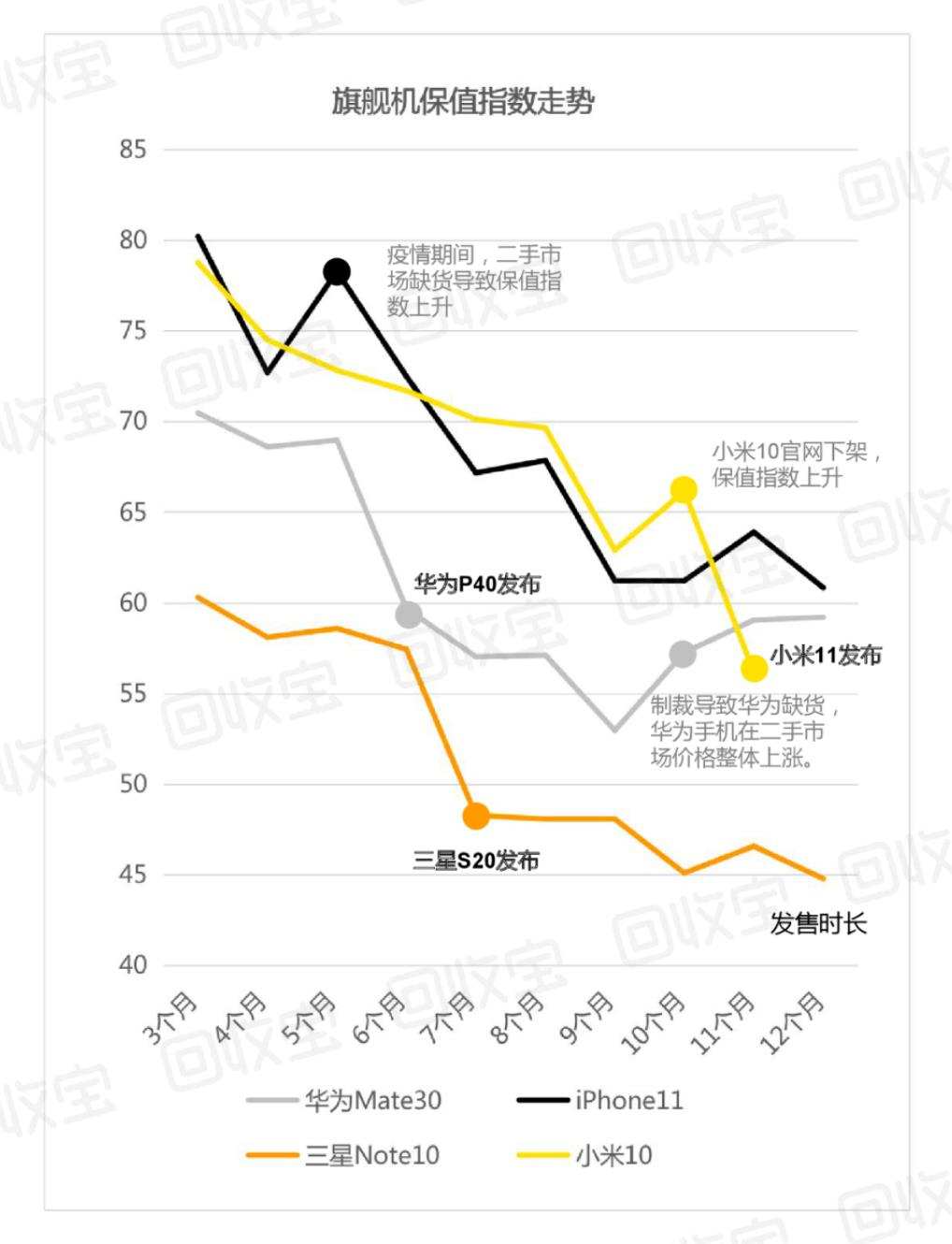 除了市场激烈竞争,给消费者带来更多选择导致安卓手机贬值等情形,新款发布上市也会是上一代安卓旗舰贬值的原因。小米10、三星Galaxy Note 10、华为Mate 30等,都出现了新款发售后二手机售价迅速贬值10%的现象,不过也有缺货等客观原因使得二手价格不降反升。