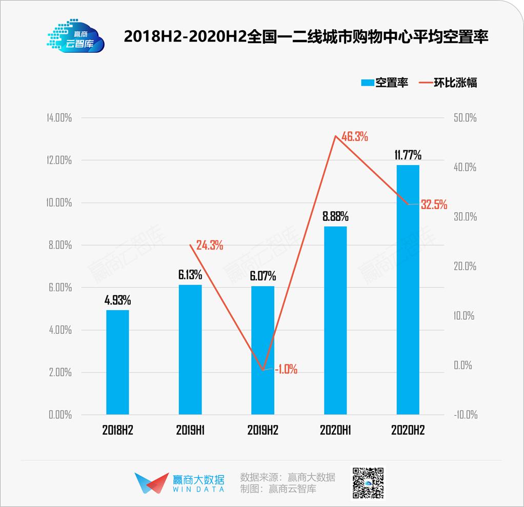 据赢商大数据监测,2020年下半年全国19个一二线城市近千家已开业购物中心调整频率加快,整体出租低迷,平均空置率环比涨幅近32.5%至11.77%。