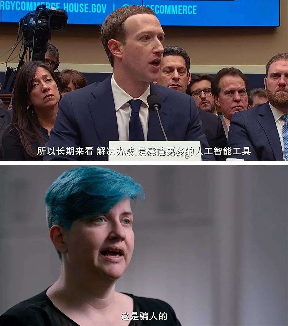 ▲ 纪录片《监视资本主义:智能陷阱》中马克·扎克伯格和 Cathy O’Neil
