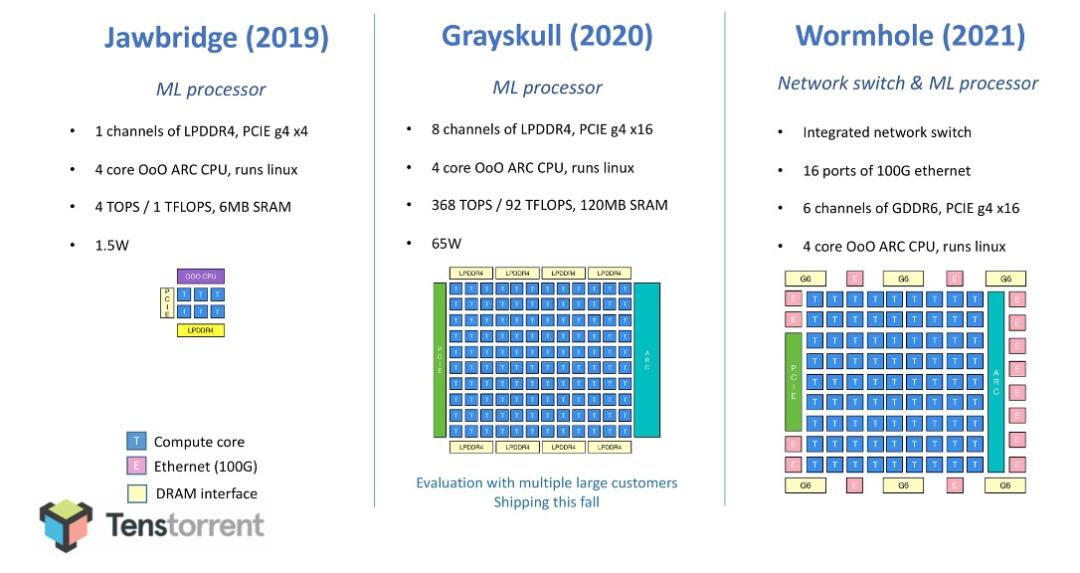 但Tenstorrent这两年也明显会加快产品推出的步伐,已经在官网上预告了下一代芯片Wormhole,该芯片更注重训练而不是加速,捆绑在16x100G以太网端口交换机中。